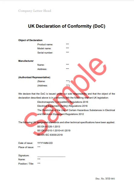 CEマーキング の適合宣言書 (EU DoC) とは別に、英国用の適合宣言書 (UK Declaration of Conformity, UK DoC) の作成が必要です。第三者機関の関与が無い自己宣言の場合、以下の点について EU DoC から変更を加える必要があります。