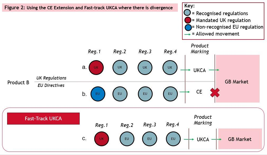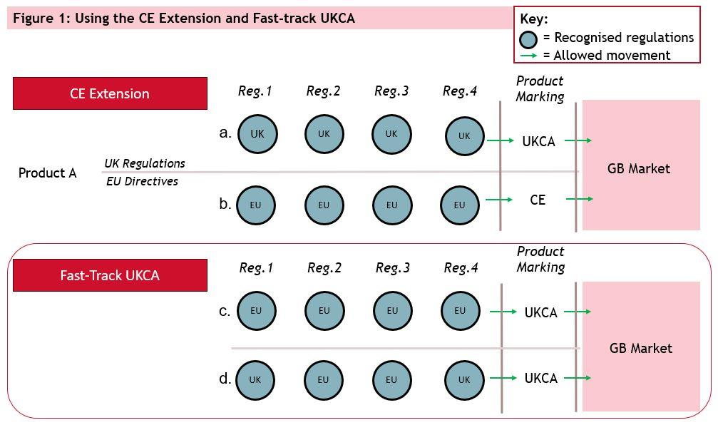 以下の図を見るとファストトラックUKCAについて、理解しやすいと思われます。(図1および図2については、Policy Update: Placing products on the market in Great Britain using UK or EU product markings より引用)